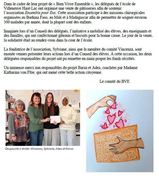L’action est soutenue par une semaine de sensibilisation en classe avec des moments de film, de lecture, de créativité, de discussions et d’animations autour de ce sujet. Elle a eu lieu la semaine du 13 au 17 novembre dans les classes de 1 à 8P!