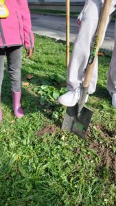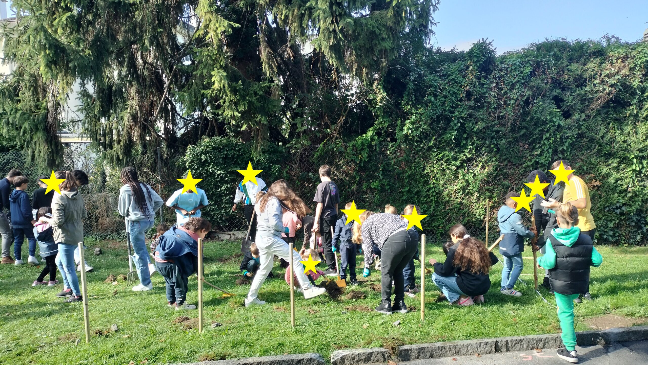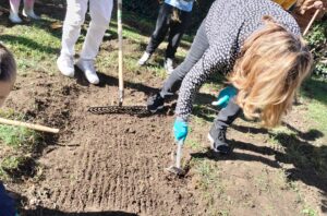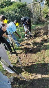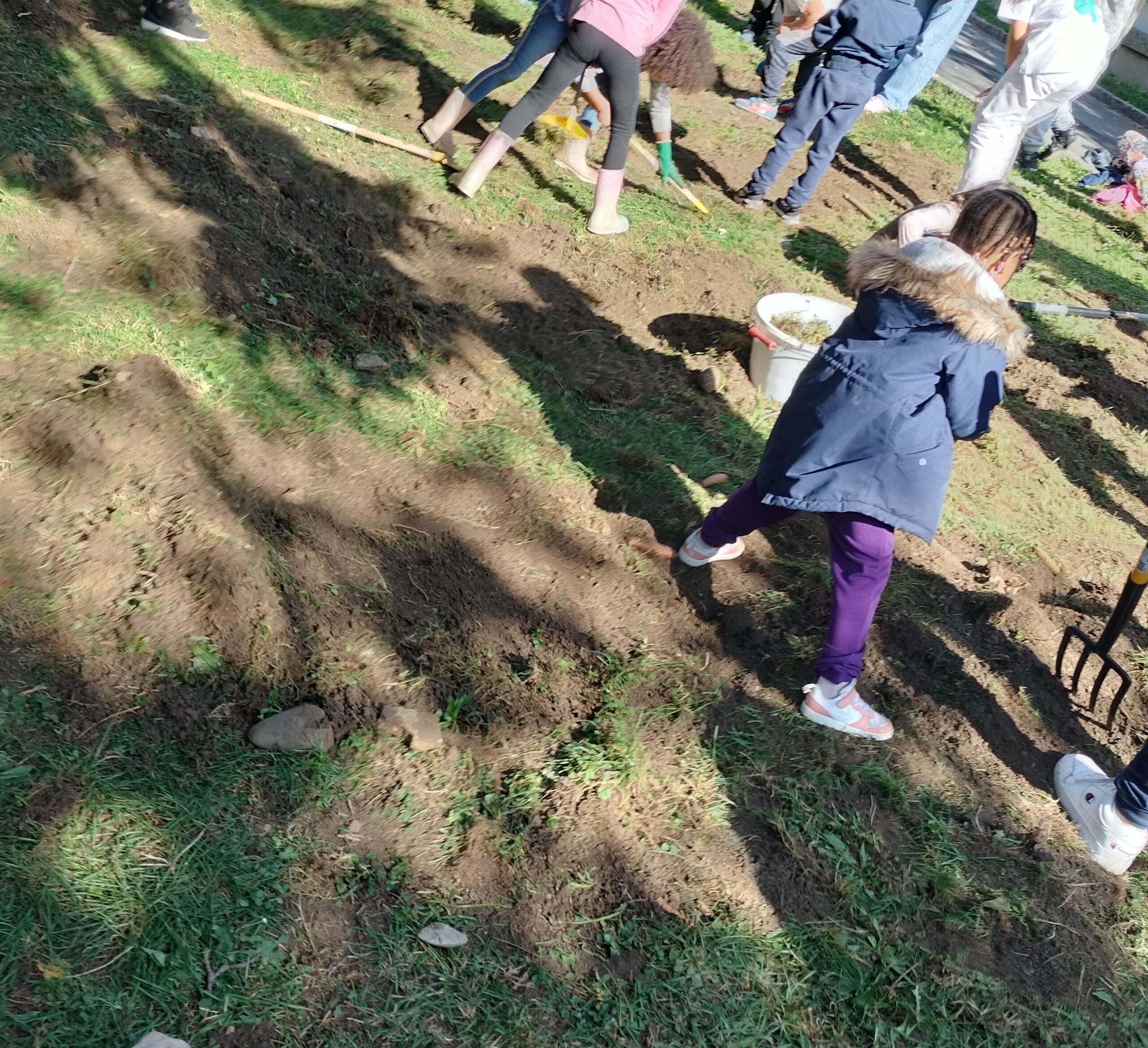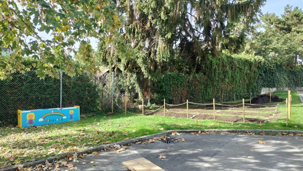 Grâce au soutien de la commune avec qui l’école a collaboré afin de trouver un terrain adéquat ainsi qu’au soutien d’une Directrice consciente des enjeux environnementaux et pédagogiques actuels, une poignée d’enseignants motivés ont sorti leur tablier et leurs plus belles bottes pour donner vie au potager que vous voyez aujourd’hui ! Ils ont bien été aidés ! Par les jardiniers-paysagistes de Villeneuve, mais aussi par leurs élèves de 1-2P et 9VG qui se sont entraidés lors d’un mercredi matin ensoleillé pour délimiter le terrain, installer les barrières, délimiter les parcelles, comment à travailler la terre etc…